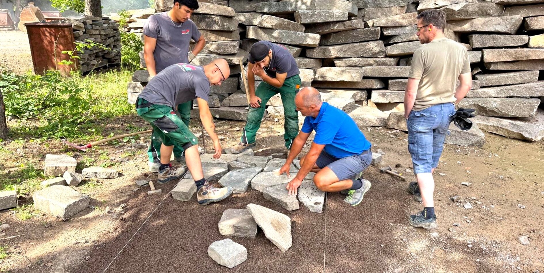 Es ging nicht nur um das präzise Zuschneiden und Bearbeiten mit den richtigen Werkzeugen, sondern auch um den Bau von Plattenwegen und Trockenmauern. Schritt für Schritt entstanden kleine Bauwerke, bei denen handwerkliches Geschick und ein Auge für Details gefragt waren.